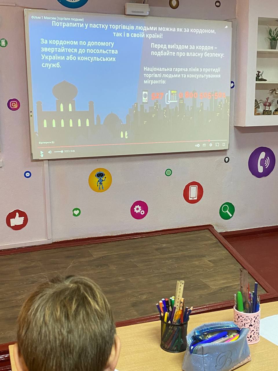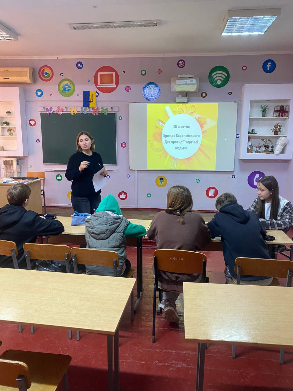 Вчитель основ здоров'я Бесараб В.С. провела урок в 9 класі "18 жовтня — Європейський день боротьби з торгівлею людьми". Соціальний педагог Коваленко Ю.В. провела бесіди 2, 4, 5 клас "Незнайомці серед нас"; перегдяд та обговорення відео з учнями 7-8 класу "Фільм 1 Максим (торгівля людьми)"; акетування серед учнів 6-11 класів «Що таке торгівля людьми?»