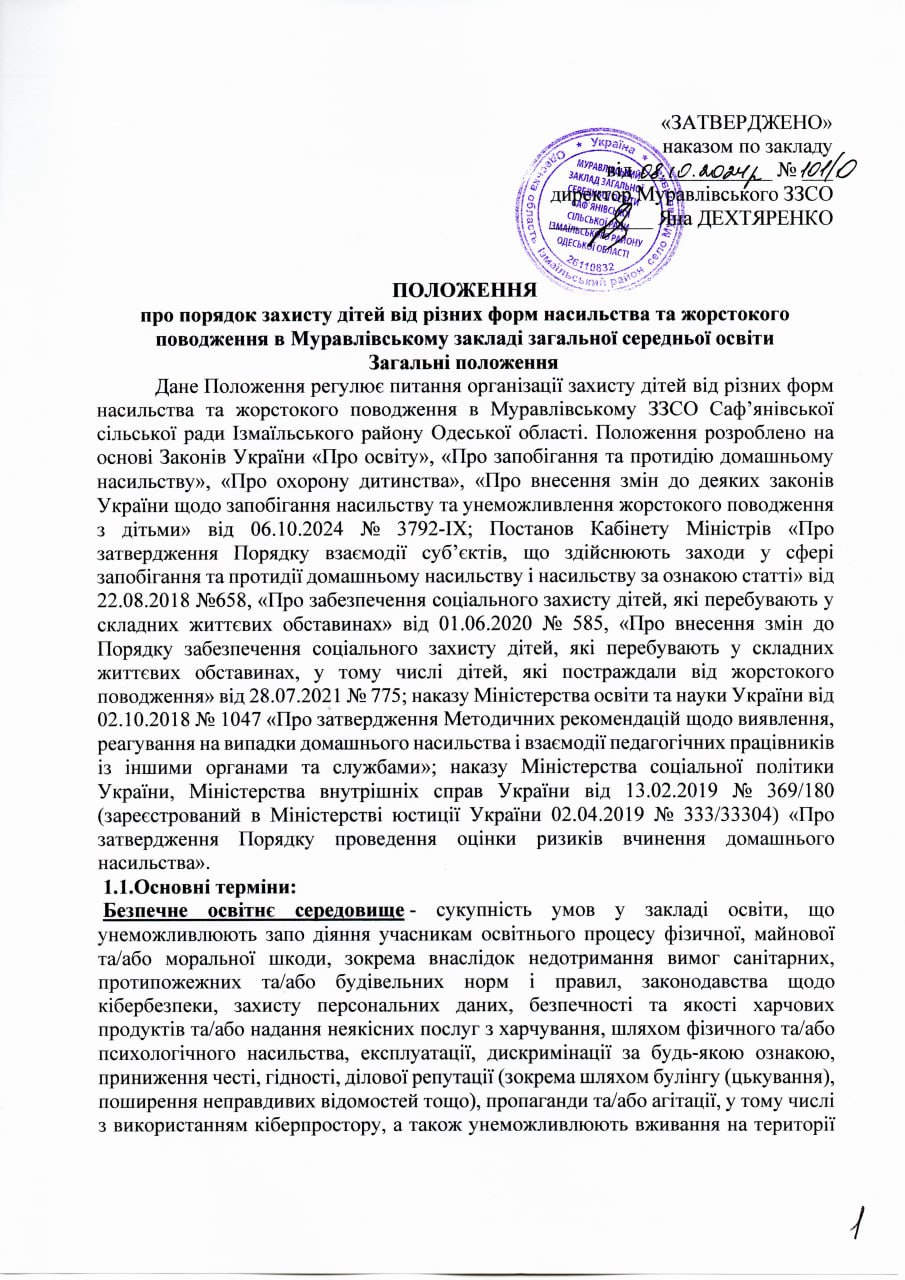 ПОЛОЖЕННЯ про порядок захисту дітей від різних форм насильства та жорстокого поводження в Муравлівському ЗЗСО
